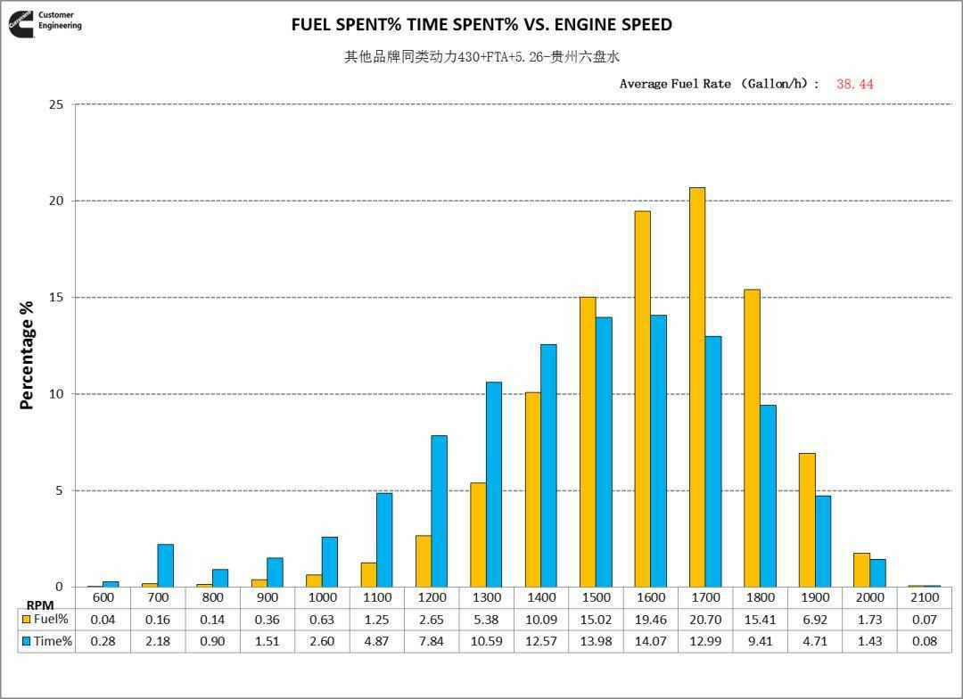 从爬坡工况转速分布看,福康X12动力转速重心在1500rpm,其他品牌动力转速重心在1600~1700rpm,福康X12动力使用转速更低。这就是福康低转速大扭矩的特性,可以让司机选择高一个挡位运行,降低了发动机转速,当然好处就是不仅满足动力性需求,还节油。